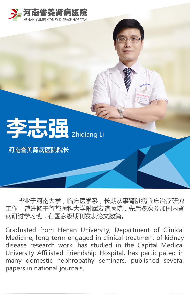 李志强院长毕业于河南大学,临床医学系,长期从事肾脏病临床治疗研究工作。从医几十年来,以精湛的技术救治了无数患者,以高尚的医德赢得了患者的拥戴,并且在一次次的实践中不断研究和学习中医知识,精通肾病综合征等肾病的诊断与治疗。