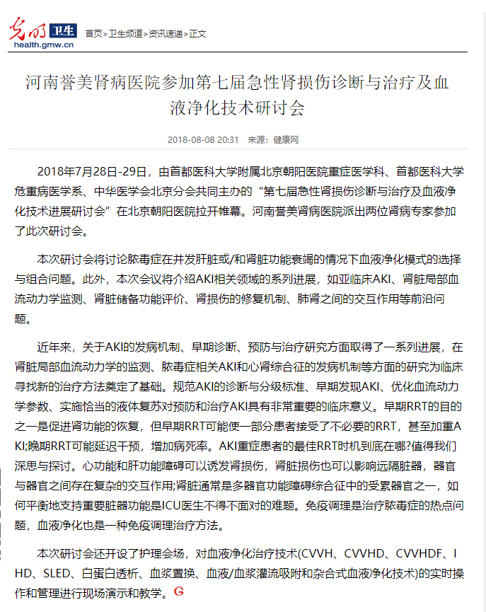 2018年7月28日-29日,由都医科大学附属北京朝阳医院重症医学科、都医科大学危重病医学系、中华医学会北京分会共同主办的“七届急性肾损伤诊断与治疗及血液净化技术进展研讨会”在北京朝阳医院拉开帷幕。河南誉美肾病医院派出两位肾病医师参加了此次研讨会。