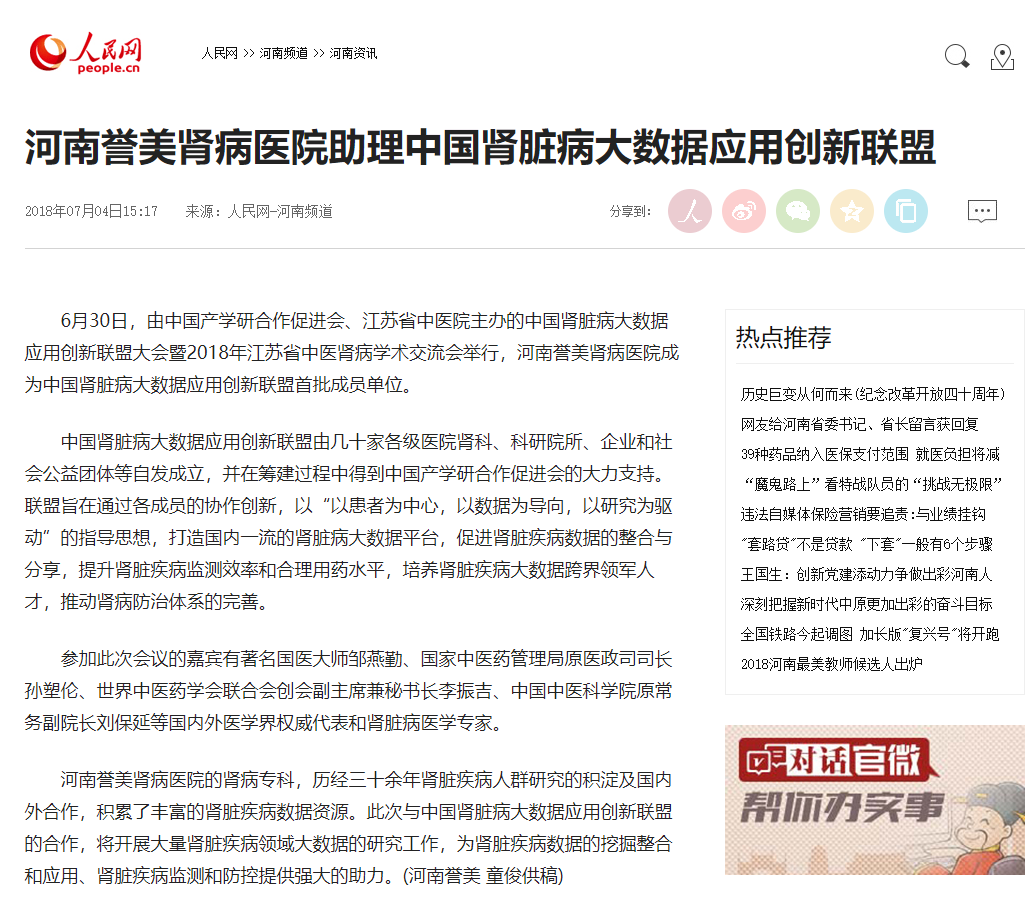 6月30日,由产学研合作促进会、江苏省中医院主办的肾脏病大数据应用创新联盟大会暨2018年江苏省中医肾病学术交流会举行,河南誉美肾病医院成为肾脏病大数据应用创新联盟批成员单位。