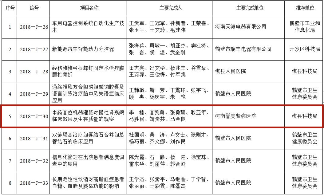 近日,由鹤壁市人民政府组织的“2018年度鹤壁市科技进步奖”评选结果正式揭晓,河南誉美肾病医院的科研成果——《中药高位机器灌肠对慢性肾衰竭临床效果及生存质量的观察》被授予了鹤壁市科技进步奖。