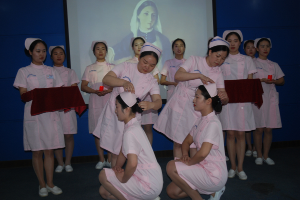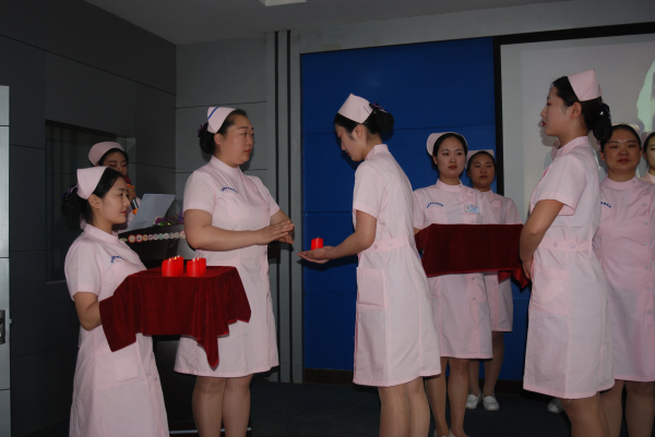 在悠扬的乐曲声中,庄严的新护士授帽仪式开始。