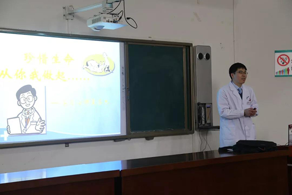 “发生险情不要慌,先要判断环境,及时施救……”祝传宾医生运用通俗易懂的语言详细讲解了心肺复苏基本知识、急救步骤和要点,并就操作过程中的注意事项进行了解说。