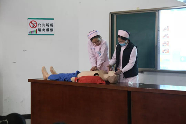 为了让大家更好掌握心肺复苏的急救技巧,张琳琳和耿瑞玲两位护士相互配合,为在座的师生们进行了心肺复苏急救技能演示,每一步操作都配合通俗易懂的讲解。老师和同学们也听得认真,看得仔细。