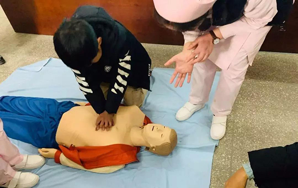 在了解心肺复苏急救步骤及各项要领后,孩子们也上前实践操作。“头要侧过来”“嘴要将病人的嘴包住”“心脏按压的位置在两乳头连线与胸骨的交界处”“按压的力量再大些”“按压时手掌不能抬起来”……在孩子们操作过程中,护士们手把手地予以再次指导。